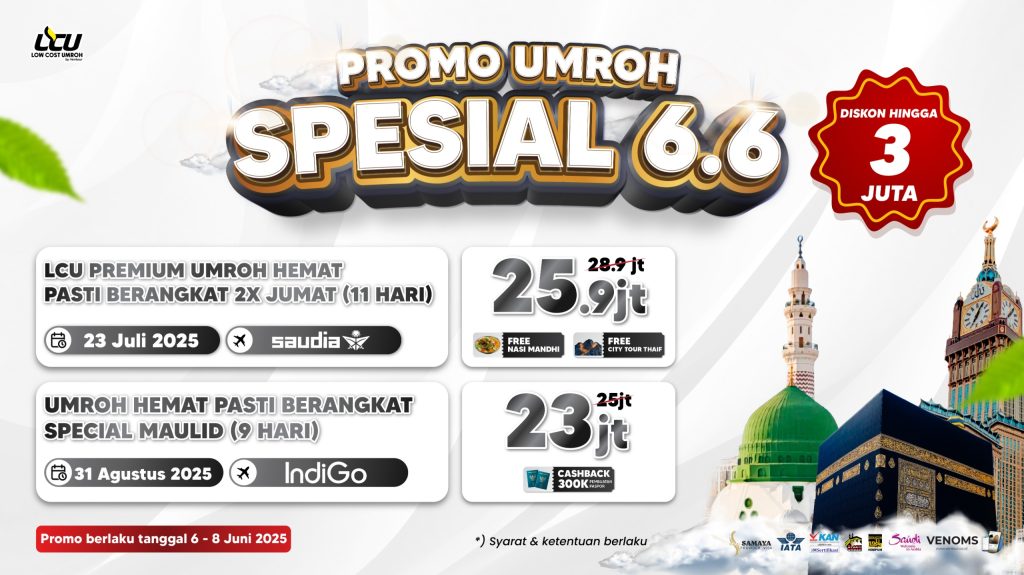 Dalam promo umroh spesial 6.6 dari Low Cost Umroh (LCU) ini, sahabat bakal dapetin banyak keuntungan menarik yang bikin perjalanan umroh jadi makin hemat dan berkesan!